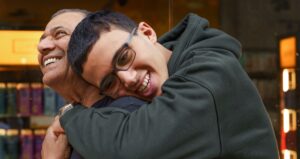 Senior Father And Son Hugging On The Mall.