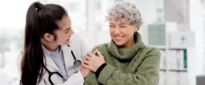 Happy, care and face of a doctor with a woman for medical trust, healthcare and help. Laughing, hug and portrait of a young nurse with a senior patient and love during a consultation at a clinic
